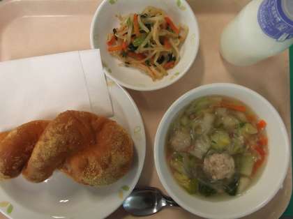 献立 黄粉揚げパン 肉団子と春雨のスープ 野菜のコチジャンダレ 牛乳
