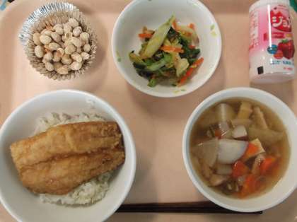 献立 いわしのかば焼き丼 のっぺい汁 白菜のポン酢和え 福豆 ジョア