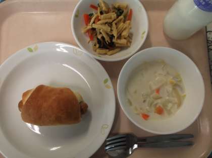 献立 ウインナーロールパン 白菜のクリーム煮 カリカリ油揚げのサラダ 牛乳