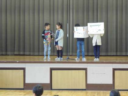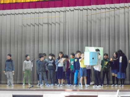 金曜日に行われる「6年生をお送る会」のお店屋さんのコマーシャルを各学年がしました。