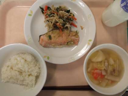 献立 ごはん さけのねぎみそ焼き ごま酢和え すいとん汁 牛乳