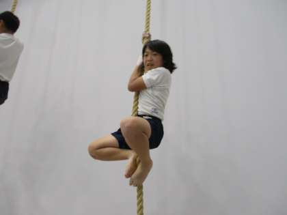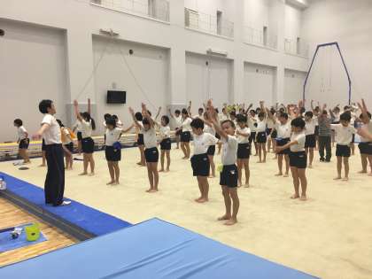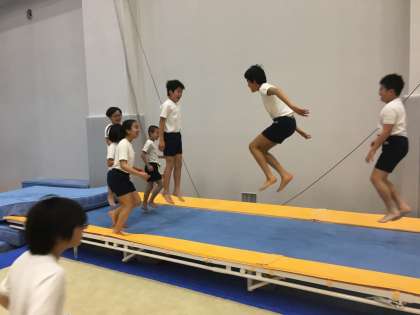準備運動も、運動量が多く汗をかきました。床運動に使用する床も思っていた以上にスプリングが効いていてよく跳ねられます。準備運動の後は、様々な体操器具を使って体験をしました。