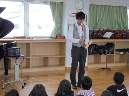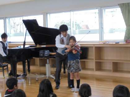 5時間目の1,2年生の音楽に、小金井市の観光大使でもあるエバリーがゲストティーチャーでいらっしゃいました。バイオリンとピアノを中心に、いろいろな楽器を紹介してくれたり、弾かせてもらったりしました。