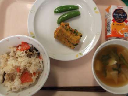 献立 オレンジジュース 里芋ごはん ツナの卵焼き スナップえんどうのごまじょうゆ みそ汁