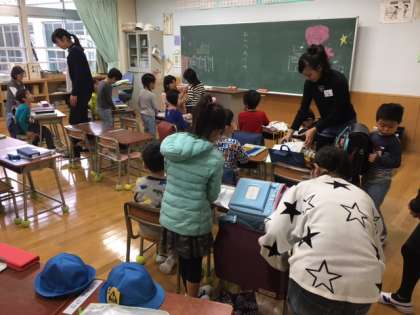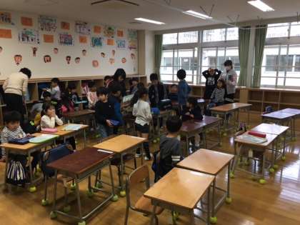 全員元気に登校しました。6年生がお世話をしてくれています。