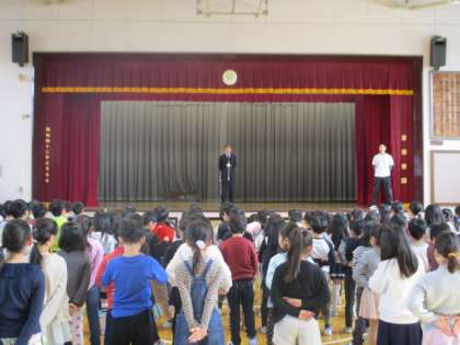 10日朝、今年度最初の全校朝礼がありました。昨年度までより時程が5分速くなりましたが、時間前にはほぼ全員の人が集合しきちんと整列できました。6年生の代表の人の朝のあいさつもとても立派でした。