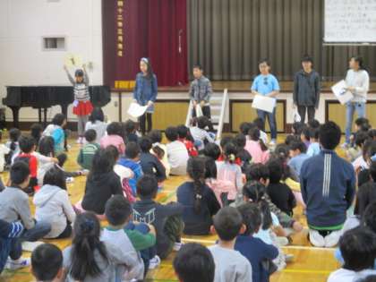 27日朝の活動は。「縦割り班発足集会」でした。会に先立ち、87回目の開校記念日にちなんで、みんなで「ハッピィー・バースデイ」を歌いました。