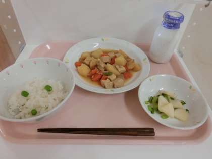 献立 グリーンピースごはん 新じゃがのそぼろ煮