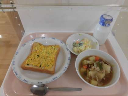 献立 卵トースト 金時豆の田舎風スープ マセドアンサラダ