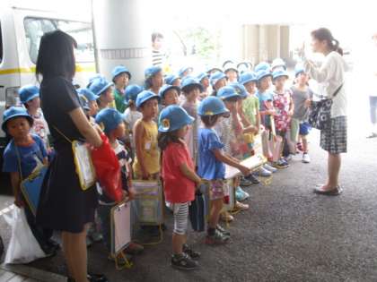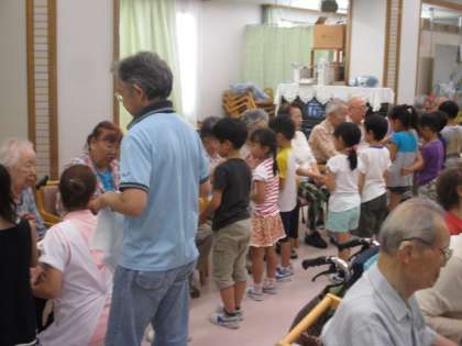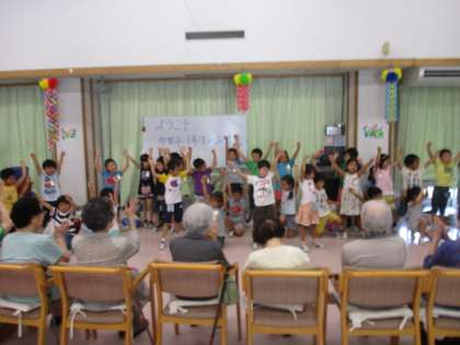 5日、七夕の願い事や飾りがたくさんついた笹を持ってフレンズケアセンターを訪問しました。七夕の歌を歌い、運動会で踊った「きらきら☆UFO」を披露しました。そのあとお手玉やあやとりを教えてもらいました。
