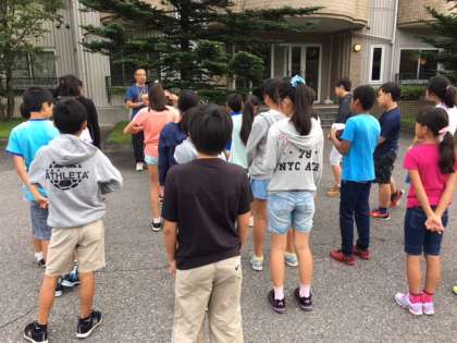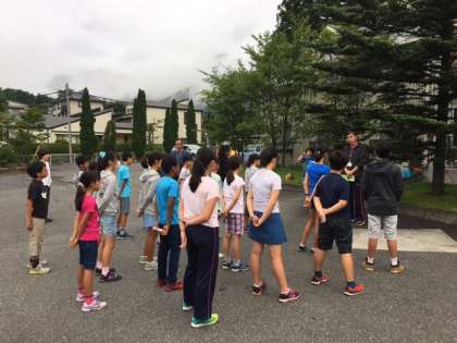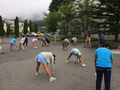 早いもので、最終日を迎えました。曇り空です。朝会、体操を行ないました。