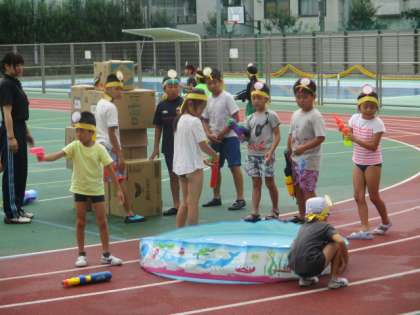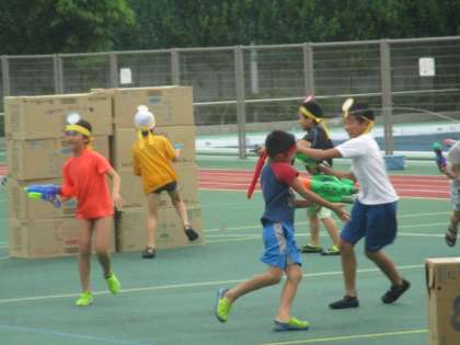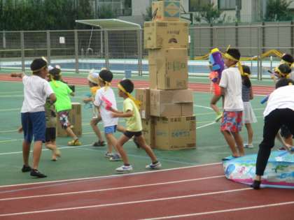 BOPのイベント「ウォーターアタック」が行われました。赤組と黄色組にわかれ、相手の陣地を水鉄砲で攻撃しました。楽しそうに一生懸命に取り組みました。