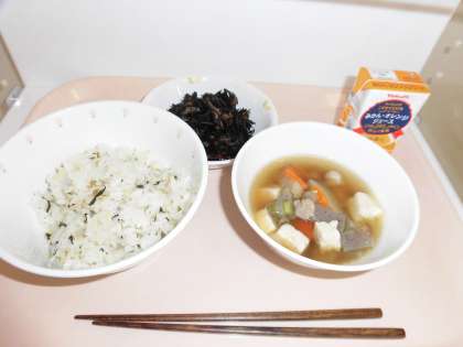 献立 菜めし ひじきの煮つけ けんちん汁 飲み物セレクト