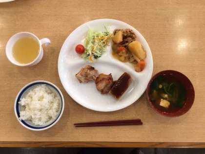 メニューは「ご飯、鶏の照り焼き、肉じゃが、わかめサラダ、豆腐と青菜のみそ汁、こんにゃく、ミニトマト、リンゴジュース」プラス「マスの塩焼き」でした。美味しかったです。