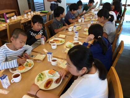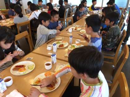 宿舎での最後の食事。3日目の朝食です。メニューは「食パン、イチゴジャム、ソーセージ、ハッシュポテト、コールスローサラダ、みかんゼリー、牛乳」です。