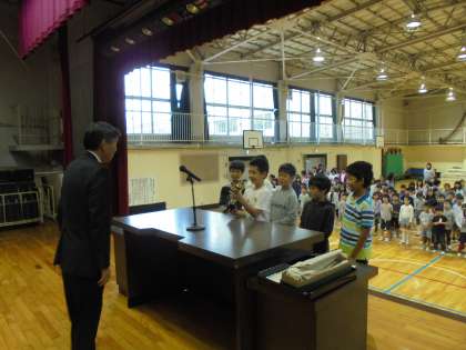 10/16(月)、全校朝会で「中里エンジョイサッカークラブ」と「中丸バレーボールクラブ」の表彰を行いました。