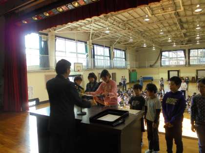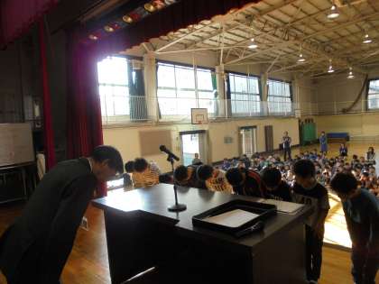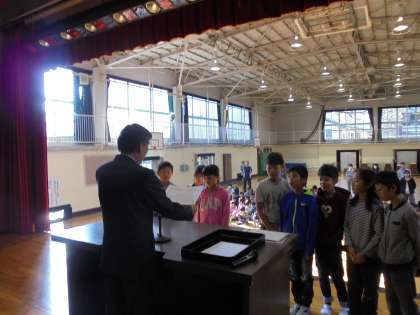 そこで、ドッジボール大会に出場した全チームに全校朝会で賞状を渡しました。