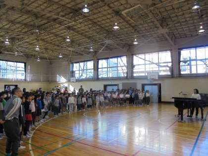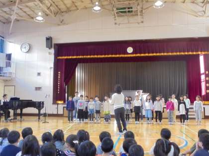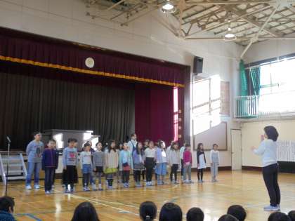 12/14(木)、音楽集会で合唱クラブが「あたまの上に空」を合唱しました。