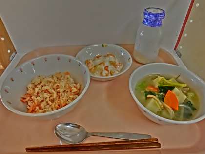 献立 鮭ごはん ベーコンと野菜のスープ フルーツヨーグルト