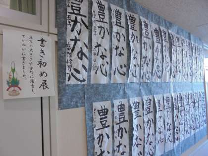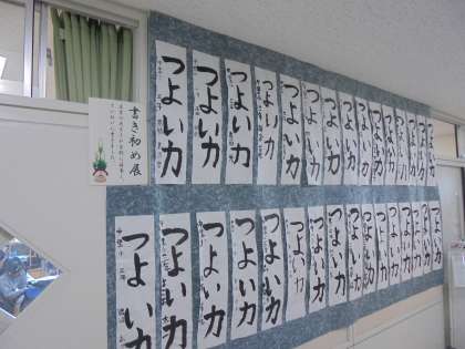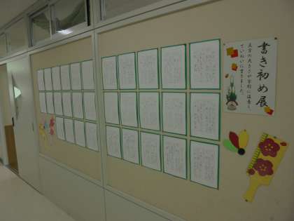 子どもたちが一画一画を丁寧に書き上げた作品を各教室前に展示しております。