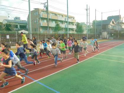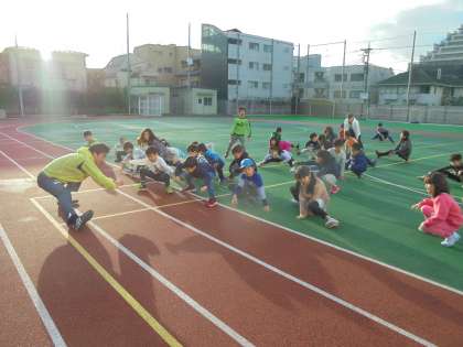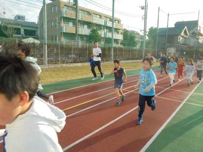 「肩の力を抜いて腕をよくふろう」「ウサギさんではなく、自分のペースを守ったカメさんの走りをしよう」など子どもたちに話をしてから、準備運動をして走っています。