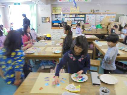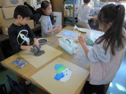 1/23(火)、2年生が図工の時間、液体粘土の感触を楽しみながら手で考えて、パワフルな顔を描く「パワフルフェイス」をつくりました。