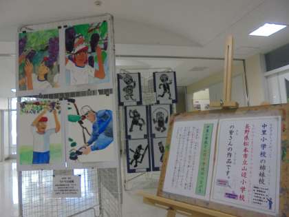 本校の姉妹校である松本市立山辺小学校との「作品交流展」を1階会議室前で行っています。学校公開等でご来校の際、ご覧ください。