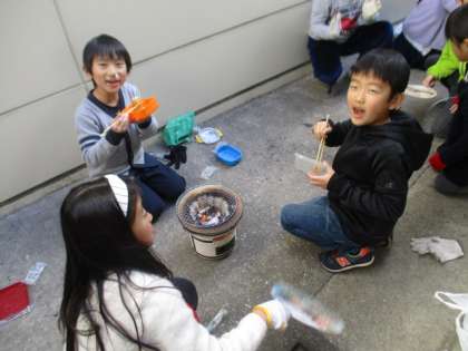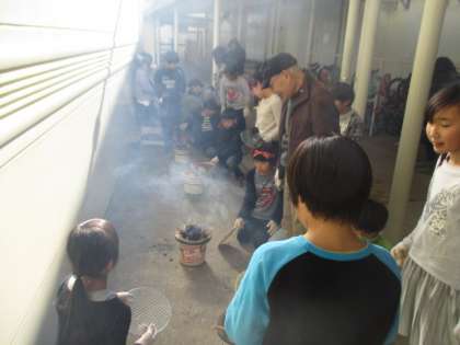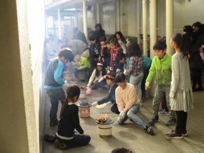 2/6(火)、3年生が社会科「昔の人々のくらし」の学習の一環で、講師に三土会の倉形さん、栗山さんをお招きし、火おこし体験を行いました。七輪で火をおこし、炭火でおもちを焼き、食べました。