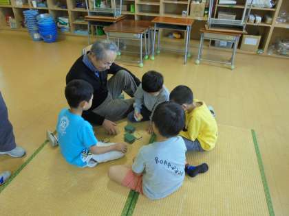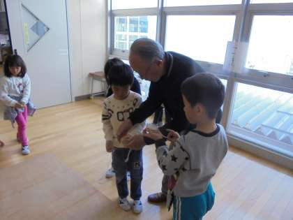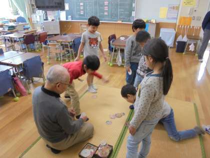 2/13(火)、1年生が近所に住む方と一緒に、メンコやこま、あやとりなど昔遊びを行いました。
