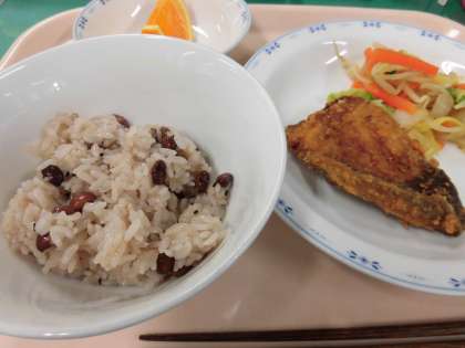 献立 お赤飯 ぶりの竜田揚げ 野菜のおかかかけ