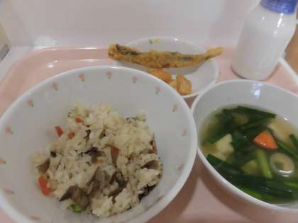 献立 鶏肉とごぼうのごはん 天ぷら(いか・ししゃも)