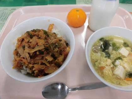 献立 キムチ丼 卵とわかめのスープ 冷凍みかん