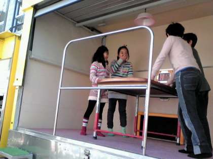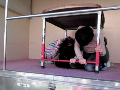 その後、4年生が起震車に乗り、震度5までの地震を体験しました。