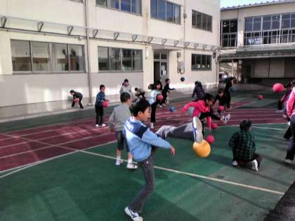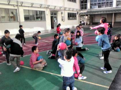 2年生が校庭で元気にボールを使って「あんたがたどこさ」しています。