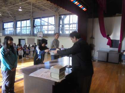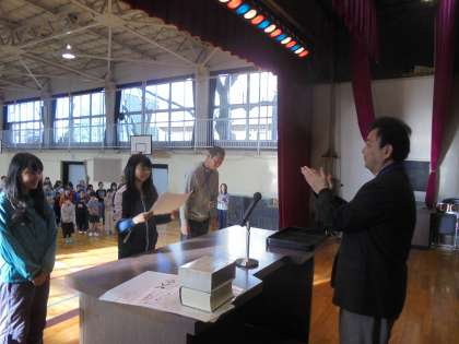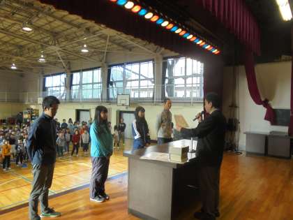 全校朝会時に出場した先生方の表彰を行いました。おめでとうございます。