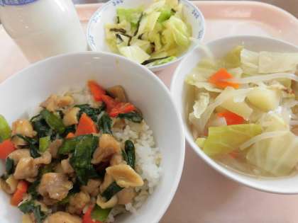 献立 トリニータ丼 野菜とベーコンのスープ