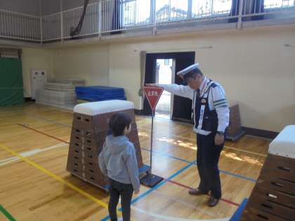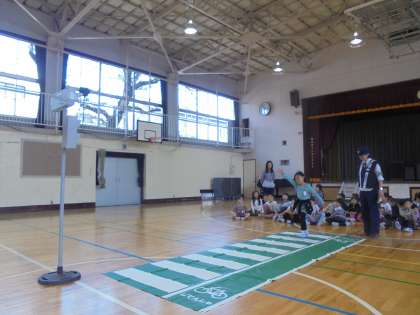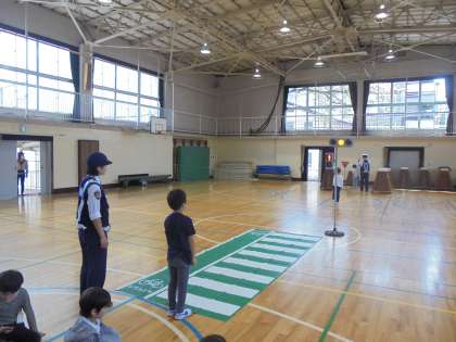 世田谷警察署のおまわりさんから、信号のある横断歩道の渡り方や信号のない場所の安全の確かめ方を教わりました。