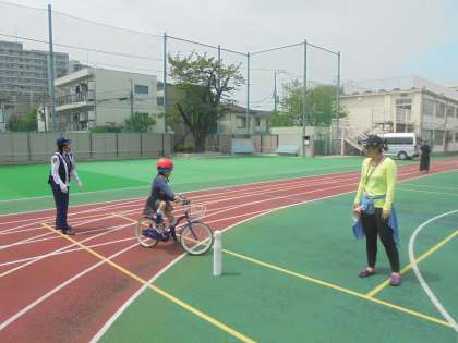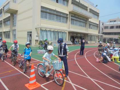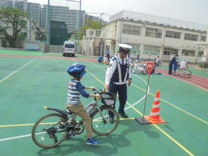 世田谷警察署のお巡りさんから、3年生が自転車に乗る際に気をつけることを教わりました。自転車に乗る際は、車や歩行者にも十分に気をつけて乗るようにしましょう