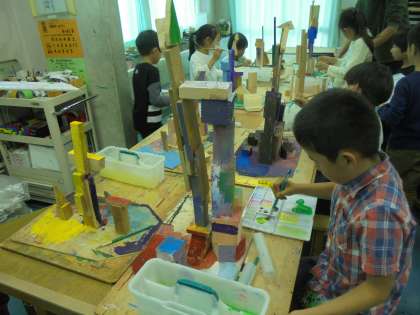 アクリル絵の具で、いろいろな色を混ぜ合わせてつくり出した色で、自分だけの「中里タワー」を生き生きと作りました。