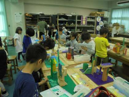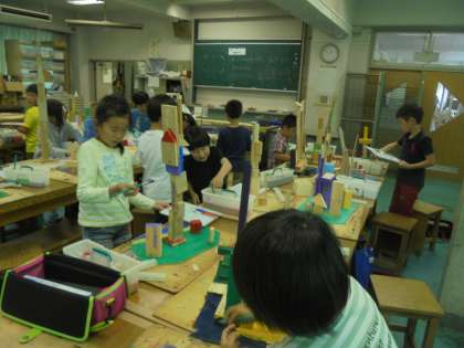 3年生は、多摩産の材木を用いて、「中里タワー」を作成しました。
