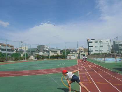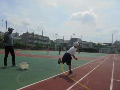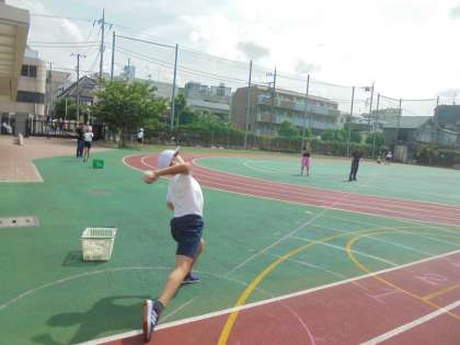 6/4(火)、体育館空調設備工事で体育館が使用できないため、今日は、全学年、ソフトボール投げを行いました。