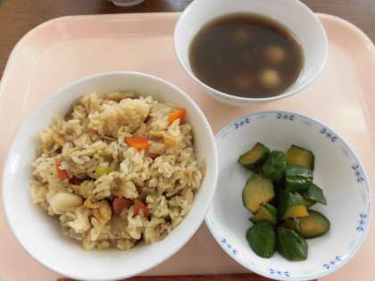 具だくさんの五目御飯に、お漬物代わりのピリ辛きゅうり。