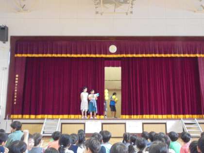 集会委員が幕の間から投げたものを当てるゲームでした。当たった時には子どもたちは大喜びでした。