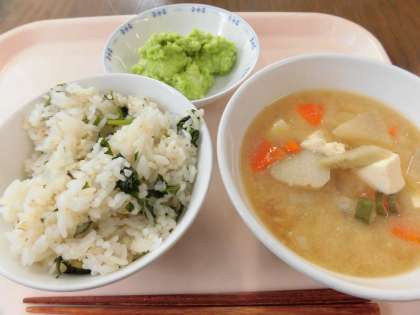 ごはんは東京八丈島名産の明日葉を混ぜ込んだ明日葉ごはん。