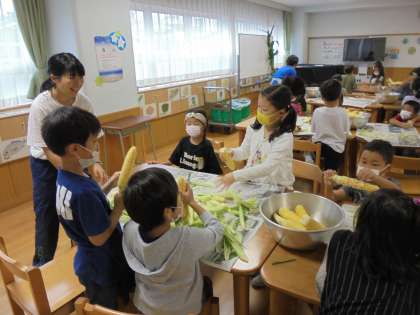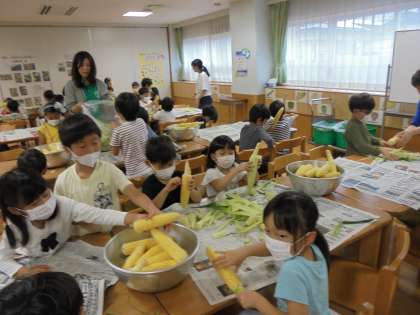 7/12(金)、1年生がとうもろこしの皮むきを行いました。