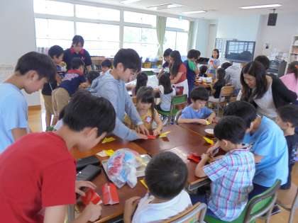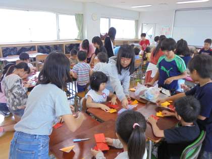 その間、子どもたちは5年生と一緒に海の生き物を折紙で作り、一緒に「魚釣り」を楽しみました。