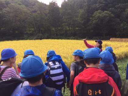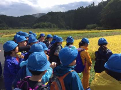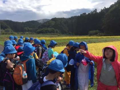 晴天になりました。棚田で金色に輝く稲穂を見学しました。