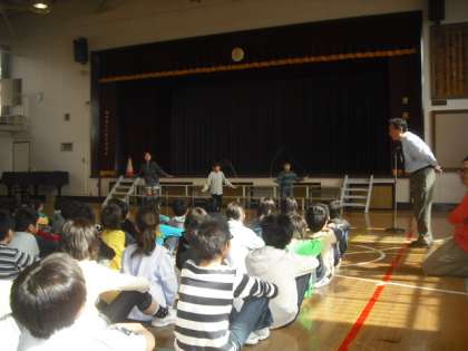 80周年記念として、実行委員会様からとびなわをいただきました。18日の朝会で校長から感謝して、大いに練習してほしいと話をしました。その後、入学式で新1年生に披露した2年生代表が全校児童の前で、二重跳びを披露しました。
