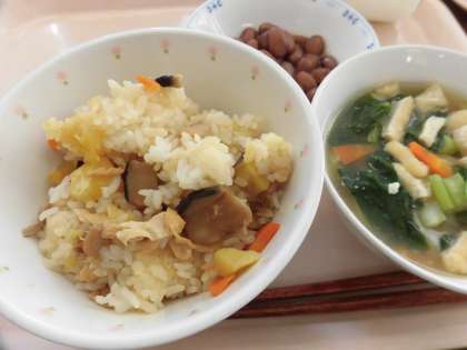 今日は秋の味覚をたっぷりたきこんだごはんの献立です。