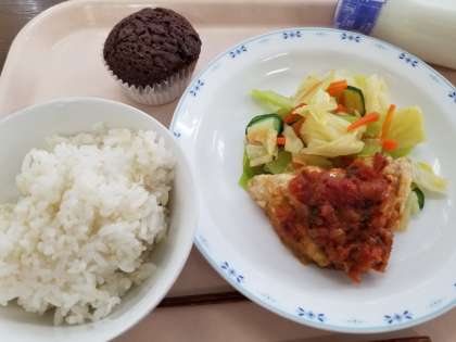 お魚はハートの形のアジの開きを油で揚げて、トマト